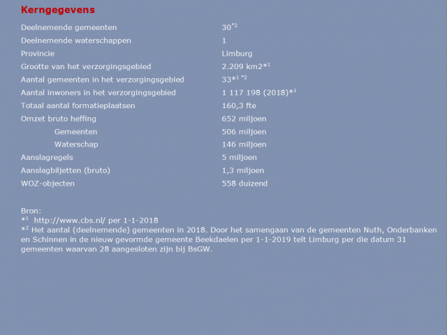Eén van de doelstellingen die voortvloeien uit de missie van BsGW is kostenreductie door schaalvergroting. Inmiddels zijn het Waterschap Limburg en 30 van de 33 Limburgse gemeenten deelnemer van de Gemeenschappelijke Regeling BsGW. De hiermee behaalde schaalvoordelen zijn verwerkt in de begroting van BsGW en hebben geresulteerd tot lagere bijdragen in de netto-kosten voor de deelnemers.