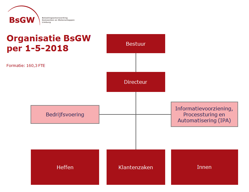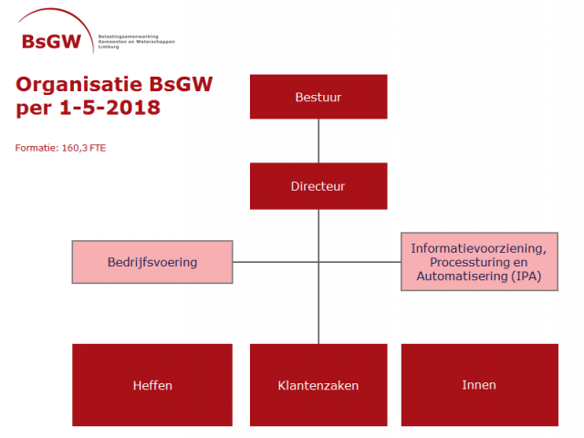 Nu de groei- en nazorgfase van de eerste vijf jaar voorbij zijn, ligt de focus op stabilisatie en kwaliteit. Dit vraagt om een volledige herijking van de organisatie, zowel formeel (structuur, functiebeschrijvingen enzovoort) als ook qua plaatsing (toetsen van kwaliteit medewerkers en leidinggevenden) en begeleiding (cultuur). Het gaat dus om een ingrijpend veranderproces dat zich de komende jaren zal voltrekken en de nodige inzet van mensen en middelen vraagt. Tegelijkertijd is actie vereist om de verbetering en continuïteit van de werkprocessen te borgen. Dit traject is uitgewerkt in het Ondernemings- en ontwikkelplan BsGW 2018-2020. Middels het ondernemingsplan committeert BsGW zich aan een taakstellende formatiereductie van 20 fte. Dit leidt uiteindelijk (na uiterlijk 7 jaar vanaf 2018) tot een lastenverlaging van € 1,3 miljoen.