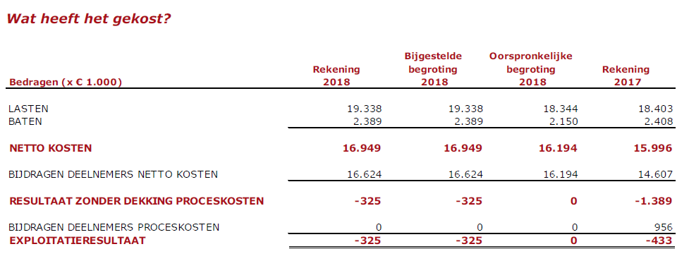 Om een verantwoorde bedrijfsvoering te kunnen borgen, zijn de grenzen van bezuinigingen (vooralsnog) bereikt. In de begroting van 2018 is dan ook rekening gehouden met indexering. Naast de extra proceskosten is er in 2018 echter geen sprake geweest van onvoorziene kosten die niet via de eigen begroting van BsGW opgevangen konden worden. De taakstelling 2018 is daarmee gerealiseerd.